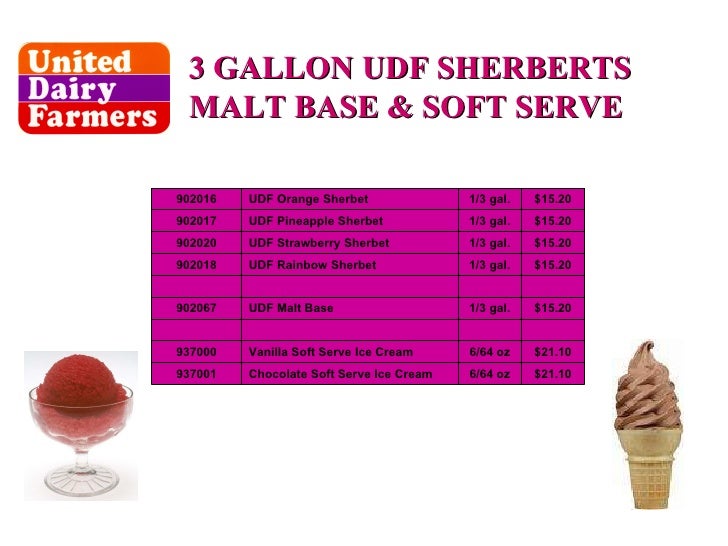 UDF ICE CREAM 3 of 3 Compiled 03/28/18 ICE CREAM - UNITED DAIRY FARMERS BRAND Size s ) ) ) ) ) ) ) ) ) Pineapple Sherbet One Dip 120 10 10.5 0< 5 15 26 Two Dip 230 15 21.5 05 35 52 51 ... Retrieve Full Source